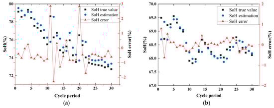 SOH estimation results for Samsung batteries under Condition 1: (a) cell D22; (b) cell D26.