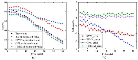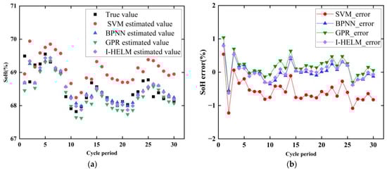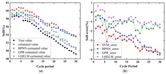 Figure 12 presents the estimation results for the Panasonic retired battery (R19). The SVM model exhibits substantial deviations from the true SOH values, with the largest errors observed throughout the estimation. In contrast, the results from BPNN, GPR, and I-HELM show smaller and more consistent errors, with I-HELM continuing to demonstrate the best overall performance in accuracy and stability.