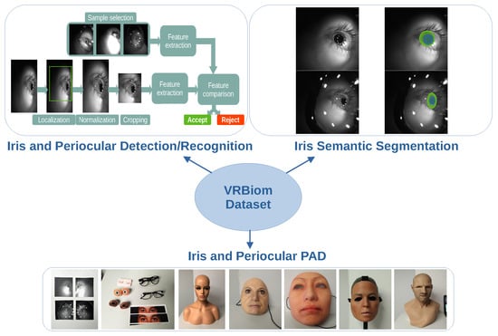 Besides its core functionality, an interesting feature of HMDs is the integrated multiple internal cameras. These cameras, typically located in the surroundings of the user’s eye region, enhance the immersive experience by tracking user’s eye movements and capturing images and videos of the user’s eyes and surrounding regions. This source of data opens up a wide range of potential applications to be explored, including biometric authentication. In biometrics, the HMDs can be instrumental in user recognition based on their iris and/or periocular traits [9]. Such applications can be employed for both identification and verification purposes, ensuring that the user accessing the device is indeed who they claim to be. In addition to the recognition accuracy, in biometric applications, safeguarding against attacks and ensuring robustness is critical. The presentation attacks (PAs), also known as spoofing, pose a serious challenge to biometric systems. These attacks can involve the use of masks, synthetic eyes, contact lenses, or printed images to deceive the system into granting unauthorized access [14,15]. Therefore, developing effective presentation attack detection (PAD) or anti-spoofing mechanisms is essential for the practical use of biometric authentication systems in HMDs. Beyond biometrics, HMDs have significant potential in other applications, such as semantic segmentation of the eye region [8,16]. This is particularly relevant for industrial, entertainment, and biomedical applications where continuous tracking of the gaze and eye movement is necessary. HMDs can facilitate near-continuous gaze tracking, which has applications ranging from interactive gaming to medical diagnostics [17,18,19]. Figure 1 depicts some of the possible biometric use-cases of HMD data.