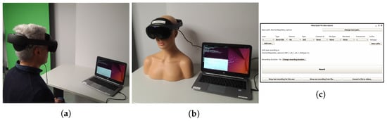 Setup for the dataset collections: (a) for bona fide recordings, the subjects wore the HMD devices; (b) for PA recordings, the HMD device was carefully placed on the temple region of the attack instrument (mannequin, in this example); and (c) the Meta Quest Pro Data Capture App used for data collection.
