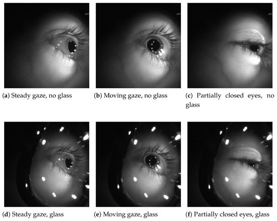 Released in 2012, the Point of Gaze (PoG) dataset is one of the HMD datasets created for gaze detection and head pose studies [30]. It comprises data from 20 subjects recorded at a resolution of . The Labelled Pupils in the Wild (LPW) dataset contains 66 eye-region videos at VGA resolution captured at 95 FPS [31]. As its name suggests, the LPW dataset features several variations in illumination, eye-wear (glasses and contact lenses), and makeup, along with gaze directions. Kim et al. introduced the NVGaze dataset, which was collected from 35 subjects [32]. This dataset focuses on gaze estimation and includes approximately 2.5 million bona fide images at VGA resolution.