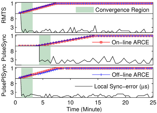 Furthermore, the experimental results of on-line and off-line ARCE are very close to each other. The convergence latency for on-line and off-line ARCE is about 1, 1, 1, 20, 15, and 15 synchronization intervals in RMTS, PulseSync, PulsePISync, FloodPISync, ATS, and MACTS, respectively. Thus, using as input is reasonable for on-line ARCE. The maximal convergence estimation error is about 21 synchronization intervals in FloodPISync. Therefore, the proposed ARCE is realizable and reliable for the comparison of time synchronization algorithms to detect local synchronization convergence.