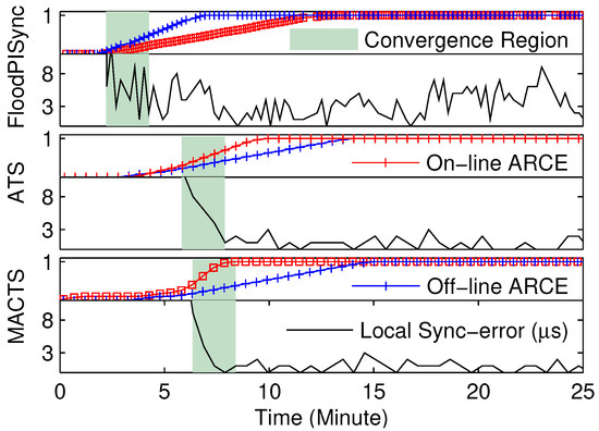 In this part, we analyze based on experimental results of FTSP, PulseSync, FCSA, PISync, RMTS, ATS, and MACTS, some of which have been reported in [21,22,27]. Therefore, some of the experimental results are used to analyze the convergence of the corresponding algorithm.