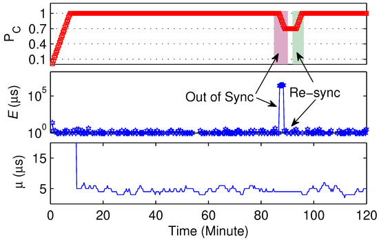 We evaluate the on-line ARCE based on RMTS and restart a node () at 87 min. The experimental results in Figure 7 are calculated with . As shown in the middle panel of Figure 7, the suddenly increases at the moment that restarts, then the of is reduced and indicates the out-of-synchronization situation (upper panel of Figure 7). In addition, ARCE also indicates the re-synchronization of . The lower panel of Figure 7 shows the of local synchronization error, where the samples among the region in which is out of synchronization are removed from the FIFO EU; thus, is a fixed value in that region.