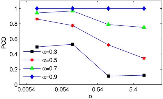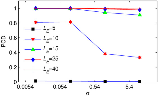 To find the relationship between the parameters , and the performance of ARCE, a simulation is built based on MACTS. Definition of probability of convergence detection (PCD): Considering the time synchronization as totally convergent, the PCD is the probability of . Hence, the PCD is used to describe the possibility of ARCE successfully detecting the convergence status. We evaluate ARCE under different delay levels, where the delay is Gaussian with mean 3.3 µs with standard deviations of 0.0054, 0.054, 0.54, and 5.4, separately. The experimental results for and are shown in Figure 9 and Figure 10, respectively. We observe that a larger or a deeper FIFO EU leads to the ARCE being more robust; as a result, ARCE achieves a higher PCD. Therefore, by adjusting either parameter or , ARCE can be made more stable and better handle the change in random delay.
