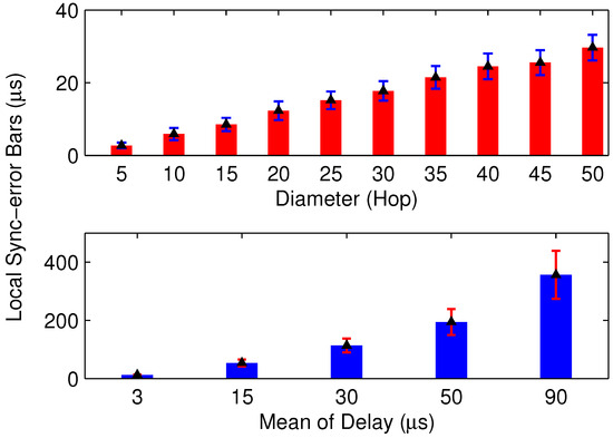 In this part, a simulation model is built for MACTS. The clock frequency offset is a random variable in the range of parts per million, and the delay is a random Gaussian variable. We evaluate the changes in synchronization error based on a line topology network, and the simulation of local synchronization is shown in Figure 11. It is clear that both an increase in the network diameter and delay will significantly increase local synchronization error. Thus, for a randomly deployed wireless network, the unpredictable network topology and delay pose challenges to setting a suitable for MACTS. Specifically, a larger value of may lead to slow convergence, while a smaller one may cause failure of the multi-hop controller.