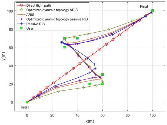 . Within the limited flight period, it is considered that the smaller the path loss, the better the channel gain provided. It can be seen that the optimized dynamic topology ARIS scheme gets closer to the users clustered on both sides. This is because the optimized dynamic topology ARIS has an active characteristic that can actively amplify and adjust signals, enabling the UAV to maintain good communication even when it is farther away from the base station. In other words, the optimized trajectory can extend to areas where communication was originally restricted. Even for the passive RIS schemes, the one with the optimized dynamic topology structure demonstrates a more efficient flight path.