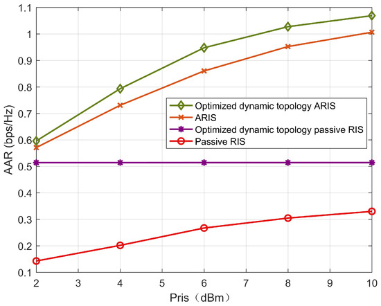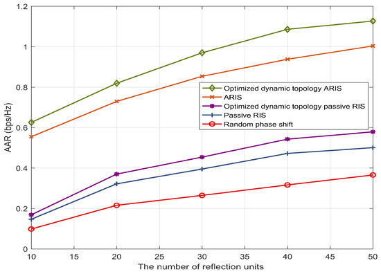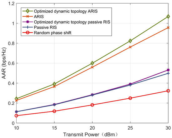 occurs, the passive RIS scheme is still far greater than the random phase shift scheme. This demonstrates the effectiveness of the proposed algorithm. The beamforming of the random phase shift has significantly improved the user’s AAR. Moreover, at this time, compared with the ARIS and passive schemes, the AAR of users in the optimized dynamic topology ARIS scheme has increased by 20% and 136%, respectively, further verifying the effectiveness of the proposed relay system in terms of communication gain.