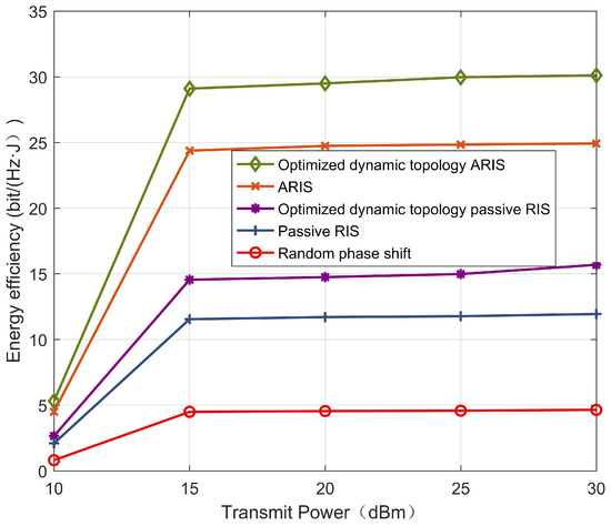 Figure 6 illustrates how the energy efficiency of different schemes changes as the transmit power increases. With the increase in the transmit power of the base station, the energy efficiency of all the scheme systems first gradually increases and then tends to stabilize. The reason is that as the transmit power increases, more power is allocated to the users, and the energy efficiency of the system becomes higher. At the same time, the system noise is also increasing. That is to say, after reaching the optimal transmit power value, the energy efficiency of the system stabilizes. Among the stabilized energy efficiency values, the optimized dynamic topology ARIS has a 19% improvement compared with the RIS, and the optimized dynamic topology passive RIS has a 32% improvement compared with the passive RIS. In the schemes with the ARIS, the significant improvement in energy efficiency effectively saves the overall system energy consumption. The reason is that the optimized dynamic topology matrix of the optimized dynamic topology ARIS optimizes the matrix energy consumption cost, saving costs while greatly improving energy efficiency. The passive devices in the passive RIS scheme do not involve unit energy consumption, but as a result, the signal gain is also sacrificed.
