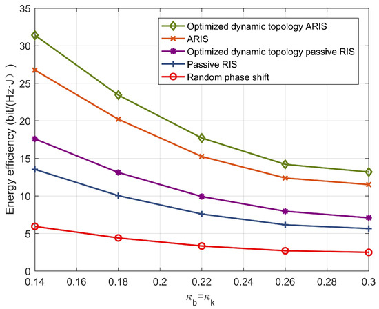 Figure 4, as the HI factor increases from 0.14 to 0.3, the energy efficiency of the system decreases significantly. The increase in the hardware impairment factor leads to an increase in system noise, and the overall performance decreases accordingly. When the HI factor rises from 0.14 to 0.3, the optimized dynamic topology ARIS scheme decreases by 59%, the RIS scheme decreases by 53%, the optimized dynamic topology passive RIS scheme decreases by 60%, the passive RIS scheme decreases by 57%, and the random phase shift scheme decreases by 56%. This demonstrates the necessity of considering hardware impairments. In real-world scenarios, the service life, device environment, and power level all affect the working efficiency of the transmitting and receiving hardware. Therefore, it is extremely necessary to evaluate the communication system based on hardware impairments.