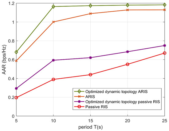 Figure 8 describes the relationship between the AAR in the optimized dynamic topology ARIS scheme and the change in the flight period. It can be seen that the longer the flight period is, the higher the user AAR is. This is because as the number of flight time slots increases, the UAV hovers above the users for more time slots, and the signal gain provided is larger. In addition, when