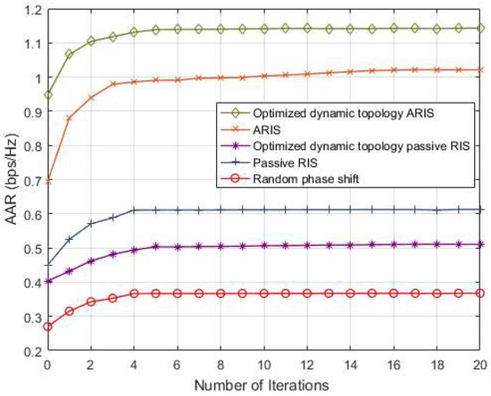. After the objective function is subjected to fractional programming and Lagrangian dualization, and then through quadratic transformation, decoupling, and alternating iterative optimization, the entire algorithm converges within five iterations. Among them, due to the amplification characteristics, the growth range of the AAR of users before convergence in the optimized dynamic topology ARIS scheme and the ARIS scheme equipped with the ARIS is much larger than that of other schemes. The stable convergence of all schemes verifies the rationality of the algorithm.