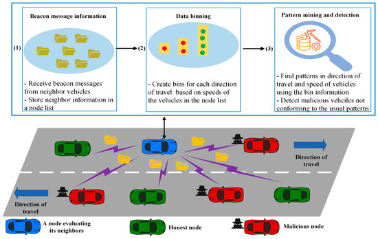 A small number is considered for to reduce the processing time of the pattern mining and detection phase. After computing for a vehicle, the corresponding bin for the direction of that vehicle’s travel is created if it does not previously exist, and the node count for that bin is set as one. If the corresponding bin is previously created, its node count is incremented by one. In both cases, the of the node is inserted into the list of node s for that bin. The sets of bins created for either direction are used in the pattern mining and detection phase to identify malicious vehicles without having to scan the node list once more. As the speeds of vehicles in an area are close to each other, only a small number of bins are created. As a result, the collective processing of nodes as bins reduces the processing time of the pattern mining and detection phase, as discussed in Section 3.3.