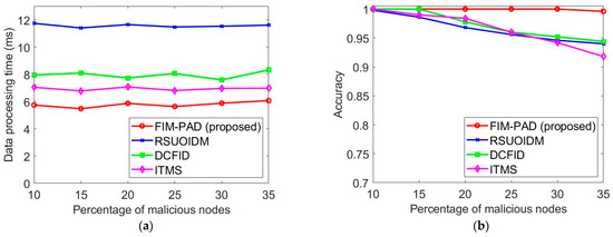 Data Processing Time: In the urban scenario, data processing time of FIM-PAD is 34% lower overall, which is seen in Figure 3a. Avoiding multiple scans of the node list to create the bins and subsequent collective evaluation of the bins in FIM-PAD offers lower data processing time compared to the other three techniques. Data processing times of all four methods are not dependent on the proportion of malicious nodes. The quantity of beacon messages to be evaluated is consistent regardless of the proportion of malicious nodes, and hence, processing time also remains stable. In RSUOIDM, the beacon messages are evaluated one by one by an RSU, causing an increase in the processing time, whereas the additional time required for clustering in DCFID leads to higher processing time, despite evaluating the nodes collectively after clustering. In ITMS, vehicles evaluate each other by processing the beacon messages one by one, resulting in higher processing times. Contrary to this, FIM-PAD does the binning by going through the node list only once, followed by a collective evaluation of the bins.