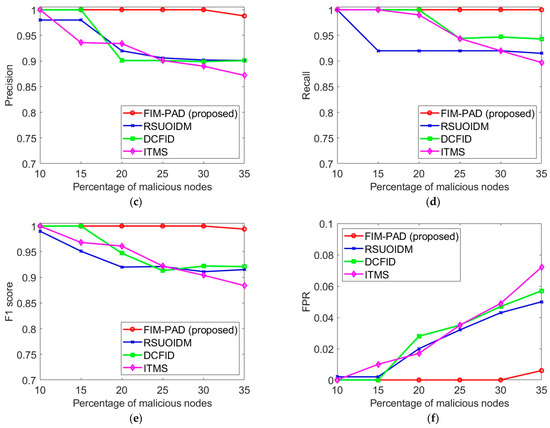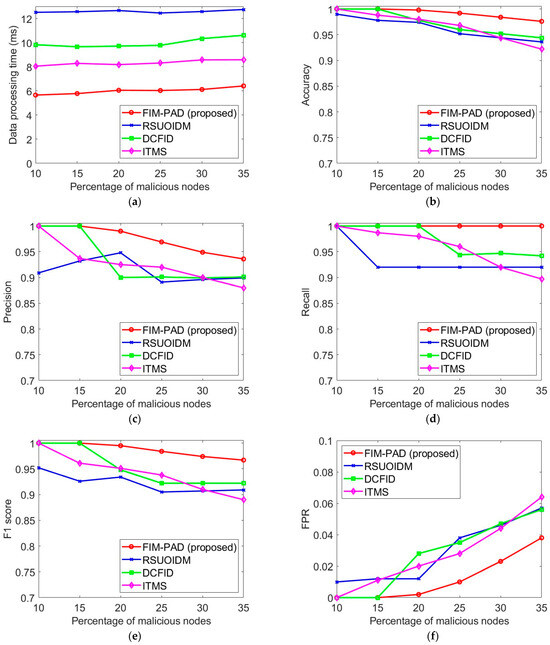 Performance comparison results of FIM-PAD with three existing approaches in urban scenario: (a) Data processing time vs. Percentage of malicious nodes; (b) Accuracy vs. Percentage of malicious nodes; (c) Precision vs. Percentage of malicious nodes; (d) Recall vs. Percentage of malicious nodes; (e) F1 score vs. Percentage of malicious nodes; (f) FPR vs. Percentage of malicious nodes.
