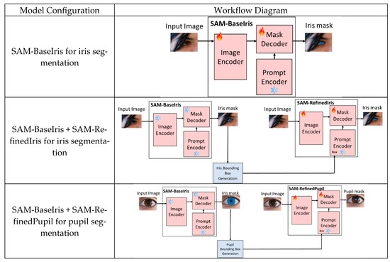 We adapted and evaluated SAM using a modular framework with progressive stages tailored for increasing levels of fine-tuning complexity. These stages involve training SAM-BaseIris for direct iris segmentation, combining SAM-BaseIris and SAM-RefinedIris for improved iris segmentation with guiding prompts, and integrating SAM-BaseIris and SAM-RefinedPupil for simultaneous iris and pupil segmentation. Figure 2 illustrates these configurations, highlighting the interplay between pre-trained components (marked with a blue snowflake icon) and fine-tuned components (marked with a flame icon).