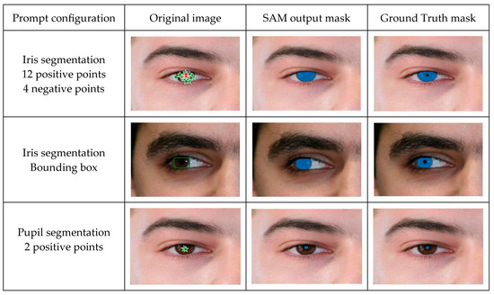 We first explored SAM’s baseline capabilities without any fine-tuning. This evaluation focused on understanding SAM’s inherent ability to segment iris and pupil regions through various prompt configurations. For both iris and pupil segmentation tasks, we developed a prompting protocol. This protocol defines the placement strategy for positive points within the region boundaries, negative points in potentially confusing areas (such as reflections or eyelashes), and bounding box construction rules based on approximate region dimensions. All prompts were generated following consistent guidelines to ensure the reproducibility of the approach.