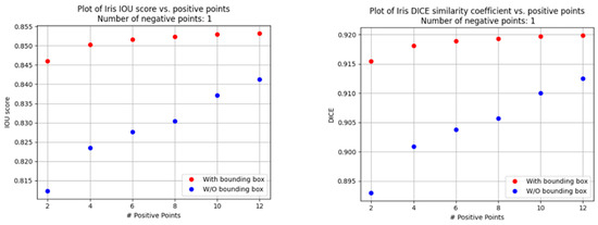 - Increasing the number of positive points improved the segmentation metrics, with performance gains plateauing after twelve points.