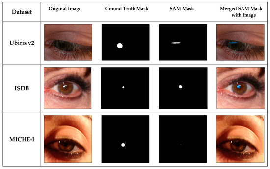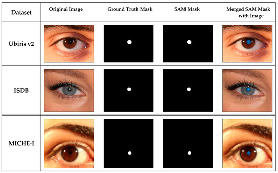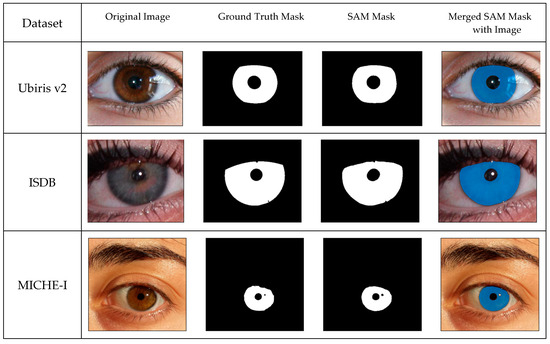 - Farmanifard, P.; Ross, A. Iris-SAM: Iris Segmentation Using a Foundation Model. In Proceedings of the International Conference on Pattern Recognition and Artificial Intelligence, Jeju, Republic of Korea, 3–6 July 2024; Springer Nature: Singapore; pp. 394–409. [Google Scholar]