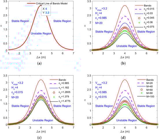 In conjunction with the earlier findings, it is evident that , , and M significantly affect system stability. Enhancements in parameters , , and M collectively contribute to enlarging stable regions and diminishing the instability threshold, ultimately promoting enhanced stability in traffic flow dynamics.