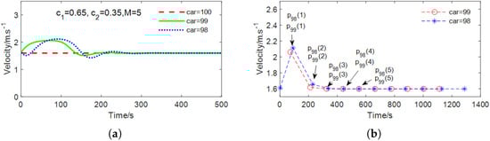 Figure 5a displays the velocity profiles of vehicles #100 (dashed red line), #99 (solid green line), and #98 (dotted blue line), emphasizing their initial responses and the ongoing adjustments in velocity. Vehicle #100 maintains a relatively steady pace post an initial adjustment period, while Vehicles #99 and #98 exhibit more significant oscillations before reaching stability, indicating their response latency and adjustment dynamics to the leader vehicle’s pace. Quantitatively, in the initial phase (0–100 s), Vehicle #100 accelerates to approximately and then levels off. Vehicles #99 and #98 initially peak at higher velocities of around and , respectively, before decelerating. In the oscillation phase (100–300 s), both Vehicles #99 and #98 display diminishing oscillations in velocity, suggesting a damping response as they adjust to the pace of Vehicle #100. Around 300 s, their velocities begin to stabilize at around . In the steady-state phase (300–500 s), all vehicles consistently maintain a velocity close to , exemplifying well-adjusted car-following behavior. Figure 5b provides a detailed examination of the extreme points in the velocity profiles for vehicles #99 and #98. The designated points ( and ) correspond to the peak and trough values illustrated in the primary graph. Initially, both vehicles peak in velocity at around 200 s; car #99 reaches approximately and car #98 approximately . Subsequent extrema ( and , et al.) display a diminishing trend in oscillation amplitude. By the fifth extreme point ( and ), the velocities have stabilized near .