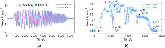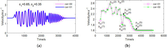 In Figure 6, both cars initially exhibit minor oscillations, which escalate before eventually diminishing and stabilizing at around . The dotted magenta line represents car #50, while the solid blue line represents car #51. Quantitatively, the initial phase (0–500 s) sees both cars starting with a velocity near accompanied by minor oscillations, indicative of the initial adjustment phase. During the mid-phase (500–3000 s), significant oscillations occur with increasing amplitude, then gradual reductions are observed. The peak velocities reached during this phase are approximately , and the troughs descend towards about . This responsive adjustment leads to periodic accelerations and decelerations as the vehicles align their speeds. Finally, in the stabilization phase (3000–4000 s), the oscillations dampen, and the velocities of both cars converge to around , signaling synchronized speed maintenance and the establishment of a steady driving state. Figure 6a also details the extremum points of the velocity profiles, illustrating an evolution through the phases. The initial peaks ( and ) see both cars reaching about at approximately 500 s. As the phase progresses, the amplitudes of the subsequent peaks (, , et al.) increase up to around 2000 s before commencing a downward trend. By the penultimate peak ( and ), the velocities start stabilizing around . The culmination of this phase is marked by the final peaks ( and around 3000 s), where the velocities converge to approximately , symbolizing the end of the oscillation phase and the onset of a stable traffic flow.