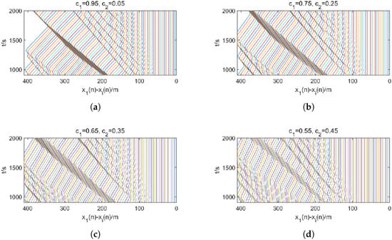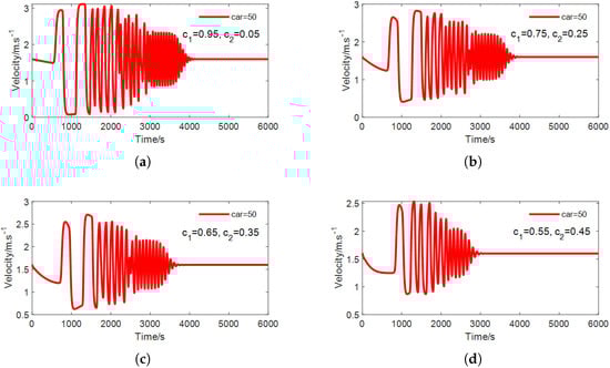 Figure 9a () exhibits dense and irregular patterns indicating significant fluctuations in vehicle spacing, large amplitude fluctuations, a longer convergence time around 1500 s, and frequent oscillations, indicating a less stable traffic flow. Figure 9b () shows more uniform patterns with reduced fluctuations, notably smaller amplitude fluctuations, a quicker convergence around 1200 s, and fewer oscillations, suggesting a more stable traffic flow. Figure 9c () showcases even more uniform patterns, further reduced fluctuations, smaller amplitude fluctuations compared to the previous diagrams, a faster convergence by around 1000 s, and even fewer oscillations, indicating a more stable and efficient traffic flow. Figure 9d () presents the most uniform patterns indicating minimal fluctuations, the smallest amplitude fluctuations among all diagrams, the quickest convergence at approximately 900 s, and the fewest oscillations, which suggest the most stable and efficient traffic flow. A comparative analysis of all four spatiotemporal diagrams elucidates the following benefits as increases: a decrease in the amplitude of fluctuations, fostering more consistent and stable distances between vehicles; a reduction in convergence time, demonstrating quicker stabilization of the traffic flow; and a decline in oscillation frequency, indicating fewer adjustments and smoother traffic operation.