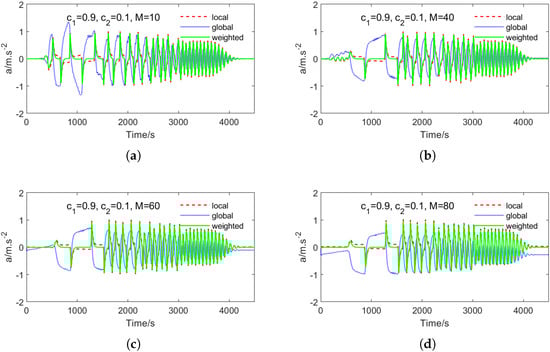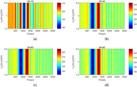The parameter M is widely recognized as defining the optimal velocity influence range universally applicable across a vehicle platoon. A series of simulations were executed to thoroughly assess the effects of M on system characteristics, both quantitatively and qualitatively, as depicted in Figure 10. For these simulations, the learning factors were set to and . The viewing fields investigated were , and 80, listed in Figure 10a, Figure 10b, Figure 10c, and Figure 10d, sequentially increasing to observe progressive impacts.