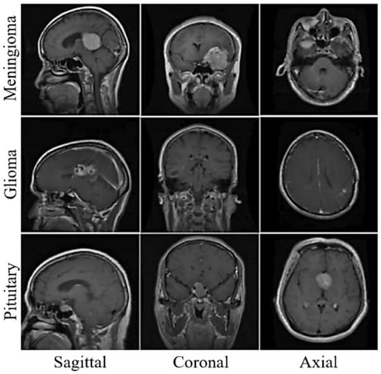 A brain tumor is a mass of abnormal cells that develops within the brain [1]. Brain tumors include a diverse range of types, which can be classified as either non-cancerous (benign) or cancerous (malignant) based on the nature and progression of the tumor cells [2]. Benign tumors develop at a slow pace and stay confined to their original location without spreading to surrounding tissues. On the other hand, malignant tumors grow quickly and have the ability to invade nearby regions. Malignant brain tumors are further classified into various types, with gliomas, meningiomas, and pituitary tumors being among the most prevalent [3]. According to World Health Organization (WHO) statistics, a brain tumor is considered one of the most common cancers [4]. Therefore, accurate classification of brain tumors using magnetic resonance imaging (MRI) is essential for controlling disease progression and lowering the mortality rate associated with brain tumors [5]. Moreover, the classification of MR images is one of the most fundamental tasks in medical image analysis, helping clinical diagnosis and treatment planning. Neurologists frequently utilize MRI scans to study the anatomy of the brain. They offer axial, coronal, and sagittal images of the brain from three different planes. MRI scans depicting these three anatomical views of the human brain are illustrated in Figure 1.