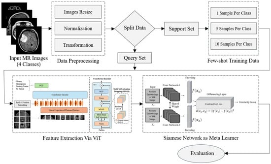 This study proposes an approach based on a transformer and a meta-learner to classify MR images with limited data. The proposed framework begins with the input of MRI images, which undergo preprocessing before being split into training and testing sets. Few-shot learning settings are applied to handle classification with limited data. After that, a vision transformer (ViT) is utilized as a feature extractor. In the target domain, metric-based meta-learning is performed by comparing feature embeddings of support and query sets to enable accurate classification. The workflow of the proposed framework is illustrated in Figure 2.