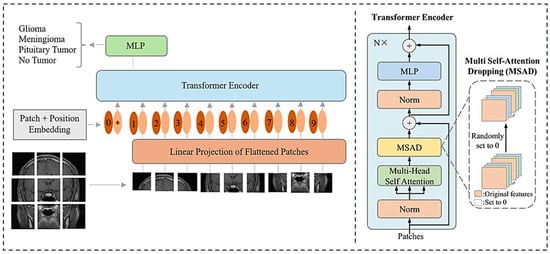 In the transformer encoder’s architecture [90], the Multi Self-Attention Dropping (MSAD) function prevents overfitting by randomly dropping some weights during training. During each forward pass, MSAD randomly sets certain outputs of the multi-head self-attention mechanism to zero. After that, a residual connection is applied, resulting in an output at the appropriate layer . As seen in Equations (2) and (3), the next block similarly starts with layer normalization (LN), then an MLP and a residual connection, producing output . LN is a standard operation used in transformer architectures to stabilize and accelerate training by normalizing inputs across the feature dimension. This encoder structure is depicted in Figure 3.