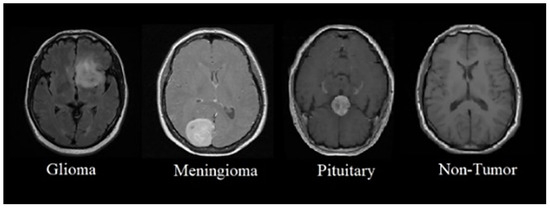The dataset for the support set is tailored to assist a few-shot learning approach, which is effective for handling scenarios with limited labeled data. The study evaluated the model’s performance under varying levels of data scarcity by organizing the training samples into three categories: 1-shot, 5-shot, and 10-shot settings. This involved randomly selecting 1, 5, or 10 examples per class to form the support set for training. The data used as the query set were reserved solely for evaluation purposes and were completely excluded from the training process. As shown in Table 1, the query set consists of unseen data, providing a reliable basis for evaluating the model’s generalization capability. The consistent shot settings were maintained between the meta-training and meta-testing stages, as any mismatch in the number of shots could degrade performance due to inconsistency in the learning objectives. This setup enabled an effective evaluation of the model’s adaptability to be limited to training data. The goal is to develop a model that is accurate and capable of generalizing across various MRI modalities and tumor types. The types of brain tumors in the dataset are illustrated in Figure 5 [91].