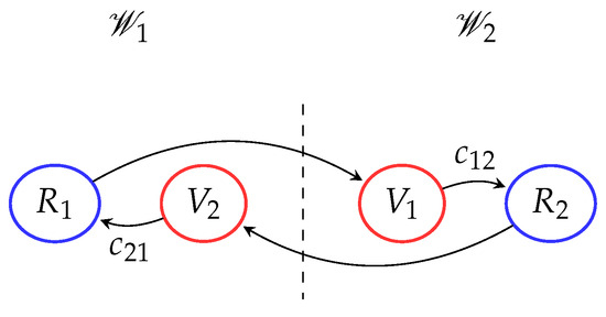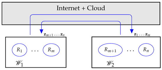 A desired global formation graph for the n robots is given by an adjacency matrix , a set of relative positions , and a Laplacian matrix . The challenge in a cyber–physical configuration is to converge to the formation specified by in the absence of certain robots in each workspace. To carry this out, the information about the positions , must be shared between and , as illustrated in Figure 1 using the internet and the cloud.