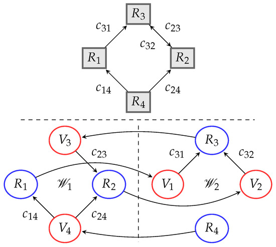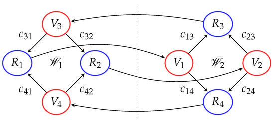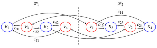 For this new cyber–physical system composed of agents generated in this way, a combined formation graph , derived from , is defined as follows.
