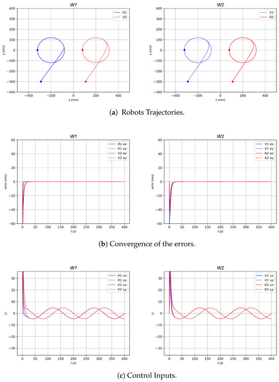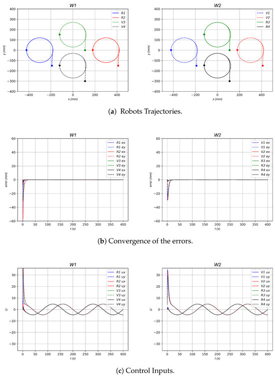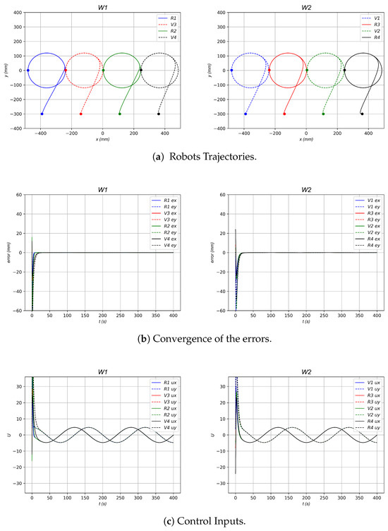 Figure 6 shows the numerical simulation of the control approach with , and ; the total number of robots is , where and , based on the workspace and topology formation, as shown in Figure 3. The leader robot is . Therefore, and , and the total members of each workspace are and .