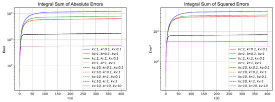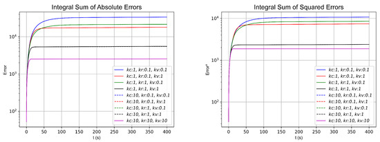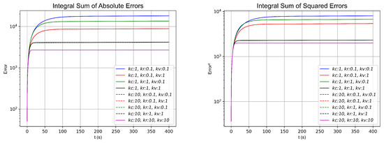 In the second formation, shown in Figure 4, several simulations were conducted by varying the values of , , and to demonstrate the stability and convergence speed of the control strategy. Simulations were performed using k values of , 1, and 10, as well as their various combinations, while ensuring that remained greater than or equal to and . For each simulation, the and norms were computed by summing the absolute errors and the squared errors, respectively, taking into account errors from both workspaces, real and virtual robots. The results are depicted in the graphs in Figure 9 and summarized in Table 2.