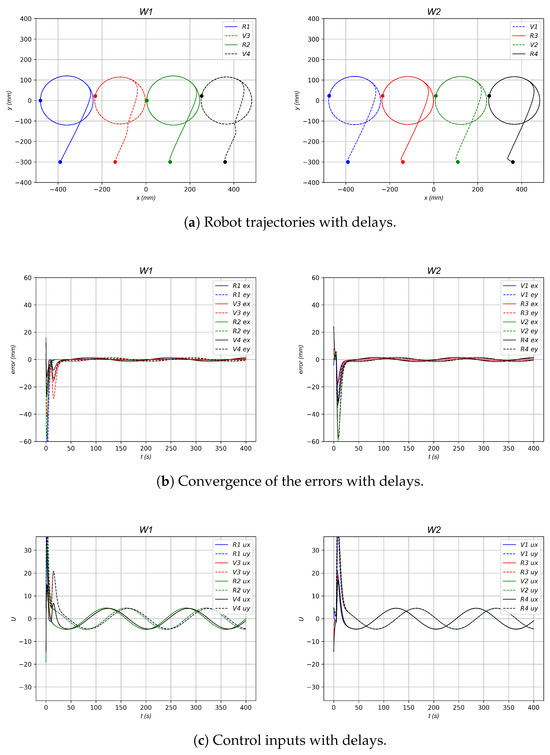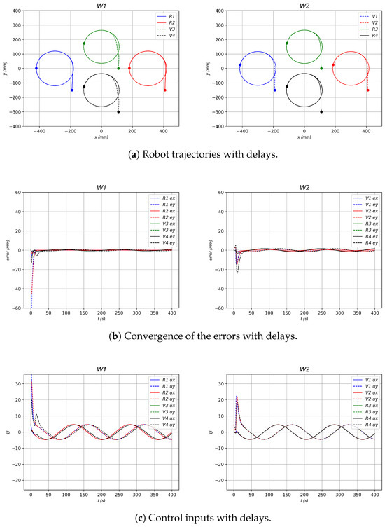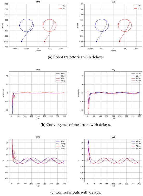 where the control gain . Note that the control law for the real robots is not affected by the communication delay between the workspaces, since all required information is within its own workspace. Defining the relative positions of the robots with respect to the desired trajectory and , Equations (4)–(6) have a relative equilibrium formation defined by