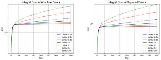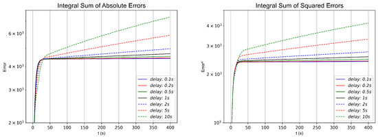 In the third formation topology, as shown in Figure 5, several experiments were performed by varying the sample rate to assess the stability and convergence rate of the control strategy. In this formation, new experiments were also carried out using different values and with different MQTT brokers. For each experiment, the and norms were calculated by summing the absolute errors and squared errors, respectively, taking into account errors from both workspaces and from both real and virtual robots. For each simulation, the and norms were calculated by summing the absolute errors and squared errors, respectively, taking into account errors from both workspaces and from both real and virtual robots.The results of the different broker test are shown in the graphs in Figure 34 and summarized in Table 11. Furthermore, graphs were generated that depict the instantaneous sum of squared errors (computed by aggregating the errors of each real or virtual robot across both workspaces) to compare which sampling times and MQTT broker configurations offer the greatest stability and the fastest convergence, despite system delays and other challenges inherent in physical robot experiments. These results are illustrated in Figure 35.