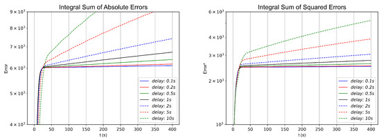 In this first formation topology, as shown in Figure 3, several experiments were performed by varying the sample rate to assess the stability and convergence rate of the control strategy. The simulations were carried out using different values of , and , and all the different dt values were evaluated with different MQTT brokers: test.mosquitto.org and a custom-developed broker hosted on Google Cloud. For each simulation, the and norms were calculated by summing the absolute errors and squared errors, respectively, taking into account errors from both workspaces and from both real and virtual robots. The results of the different broker test are shown in the graphs in Figure 26 and summarized in Table 9. Additionally, graphs were generated that depict the instantaneous sum of squared errors (computed by aggregating the errors of each real or virtual robot across both workspaces) to compare which sampling times and MQTT broker configurations offer the greatest stability and the fastest convergence, despite system delays and other challenges inherent in physical robot experiments. These results are illustrated in Figure 27.