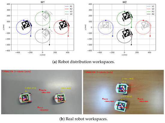 The adjacent subsets for the real robots are defined as , , , , as shown in Figure 3. The desired final formation of the robots is a horizontal line, as if both real robots were in the same workspace. To achieve this desired formation pattern, the relative vectors are given by , with and by construction .