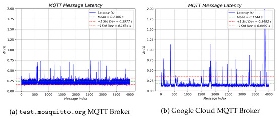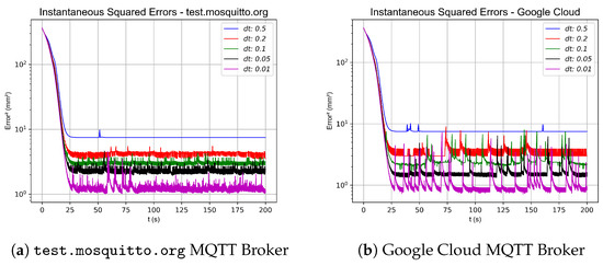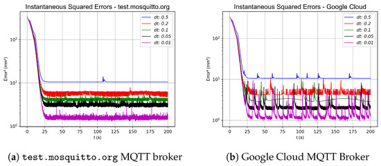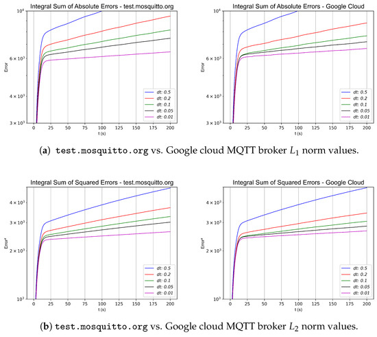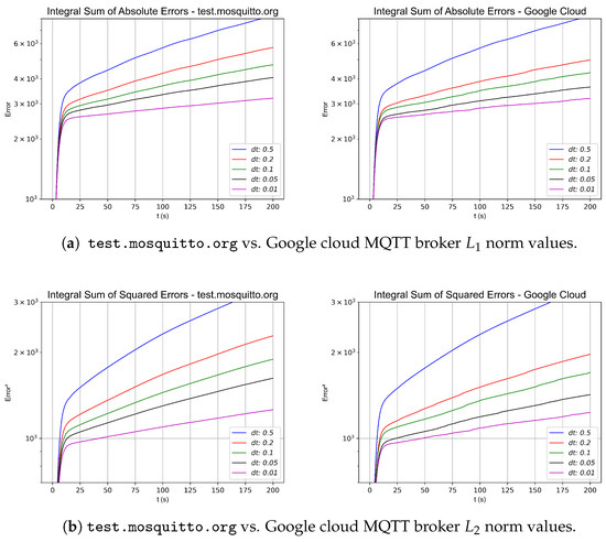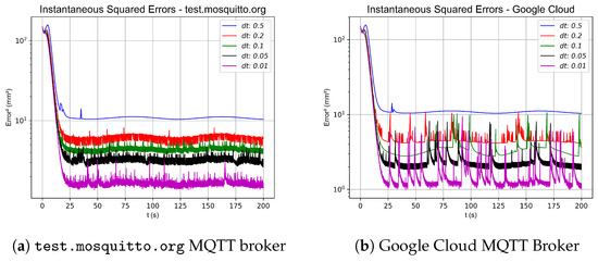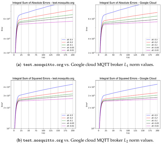 Furthermore, an analysis of the and norm tables from the three experiments shows no significant differences between the commercial broker test.mosquitto.org and the Google Cloud broker. In particular, in all experiments, the Google Cloud broker yielded slightly lower and norm values, indicating reduced errors with this MQTT service. This result is directly related to the latency and transmission speeds measured in Section 5.2, where test.mosquitto.org exhibited an average latency of s, while the Google Cloud broker showed a latency of s, as illustrated in Figure 22.