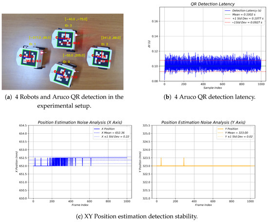 Figure 24 shows the experimental results with a ; the desired trajectory of the leader robot is given by in millimeters and the MQTT broker test.mosquitto.org. The robots converge to the desired formation pattern. The robots’ trajectories are observed in Figure 32a, and error convergence is shown in Figure 32b. Note that the errors of the real robots are smaller than the errors of the virtual robots in the experimental data. The control inputs are depicted in Figure 32c, and note that the control input is saturated at a maximum value and a minimum value of . Note that the control performance is affected by the resolution of the camera, the sample time, and the non-modeled dynamics effects.