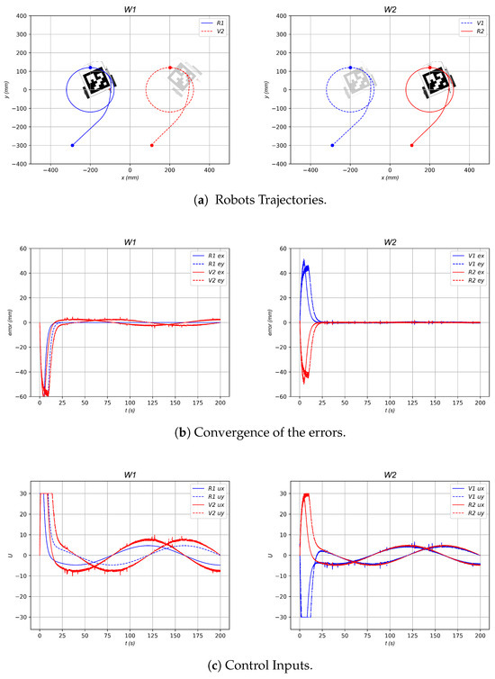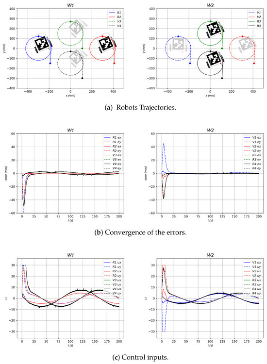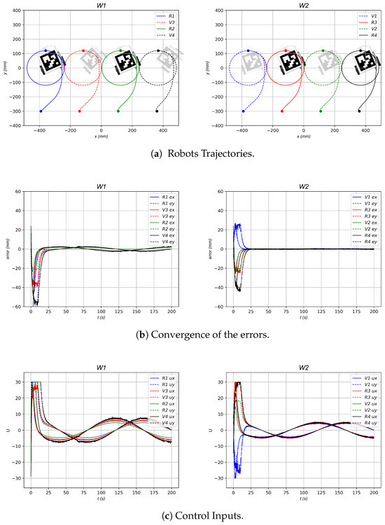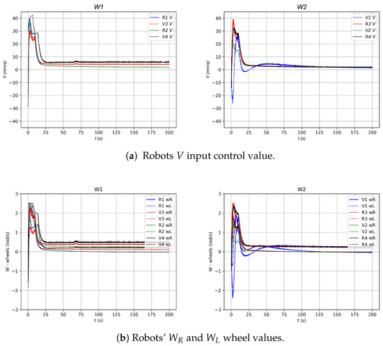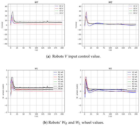 Figure 25 illustrates the longitudinal velocity values V relative to the midpoint between the wheel axes; see Figure 25a. Furthermore, Figure 25b presents the angular velocities, and , corresponding to the right and left wheels of each robot, respectively. Note that the angular wheel velocities are saturated at a maximum value of rad/s and a minimum value of , due to the maximum speed that the physical motors on the experimental platform can achieve.