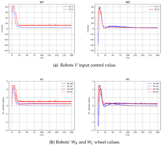 Figure 33 illustrates the longitudinal velocity values V relative to the midpoint between the wheel axes (see Figure 33a). Furthermore, Figure 33b presents the angular velocities, and , corresponding to the right and left wheels of each robot. Both are saturated at a maximum value of and a minimum value of , due to the maximum speed that the physical motors of the real robots can achieve.