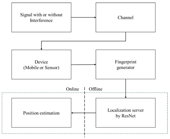 The proposed indoor positioning framework, as illustrated in Figure 1, is based on a terahertz wireless sensor framework, which operates in both offline and online phases. The localization system consists of six blocks: signal and interference input, channel, positioning device, fingerprint generator, localization server, and position estimation output. The positioning device is typically a mobile device such as a smartphone or an IoT sensor. This device collects the 6G signal and sends the gathered data to the server for location processing.