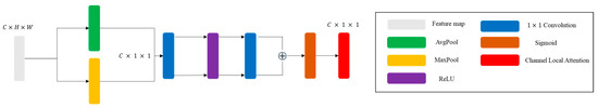 CLAB is designed to refine channel-wise feature representation by leveraging information. As shown in Figure 3, CLAB first applies average pooling and max pooling along the spatial dimensions of the input feature map (), producing two-channel descriptors of size . These pooled features encode different aspects of the channel information. The pooled features are processed through a convolutional layer with a ReLU activation function, followed by another convolutional layer to generate a refined channel representation. The output is then passed through a sigmoid activation function to produce a channel attention map of size . This attention map is used to emphasize informative channels, improving the network’s ability to capture meaningful features [18,19]. Note that only using the average strategy could weaken the salient features; thus, we use max-pooling to gather other important information about distinctive object features to infer attention maps. The sigmoid activation layer is used to obtain the probability of which channel to focus on. In other words, CLAB is designed to focus on which channel is important for the given input feature map.