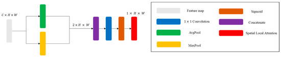 SLAB is designed to enhance spatial feature representation by capturing spatial dependencies. As shown in Figure 4, SLAB begins by applying both average pooling and max pooling along the channel dimension of the input feature map (), generating two spatial feature maps of size . These two maps are then concatenated to form a unified spatial representation. The concatenated feature map is processed through a convolutional layer, followed by a sigmoid activation function to generate a spatial attention map of size . This spatial attention map highlights essential regions in the feature map, allowing the network to focus on significant spatial features.