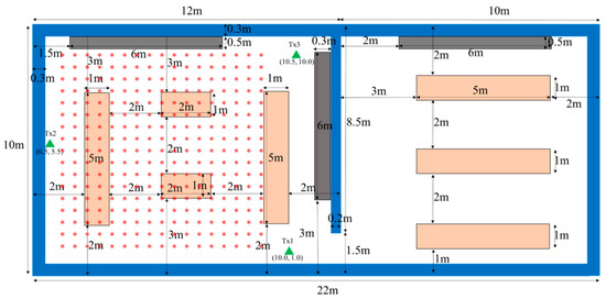 There are three metal bookcases, with a height of 2 m, and seven desks with a height of 0.7 m in the laboratory. Three transmitters, of 1 m tall, located at Tx1(10, 1) m, Tx2(0.5, 5.5) m and Tx3(10.5, 10) m are used to transmit the signal. 289 receivers, all 1 m in height, are uniformly distributed from (1, 1) m to (9, 9) m as shown in Figure 5. The Adam optimizer is used for training, including 200 epochs with a mini-batch size of 128, and an initial learning rate of 0.002. The training is conducted on a GPU. L2 regularization and gradient clipping are employed to improve performance.