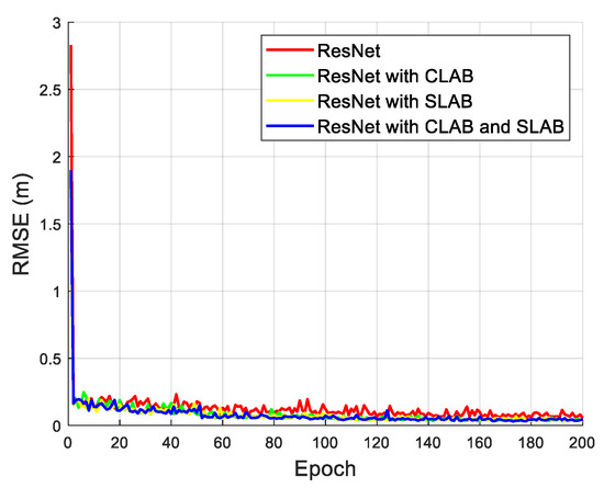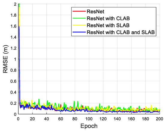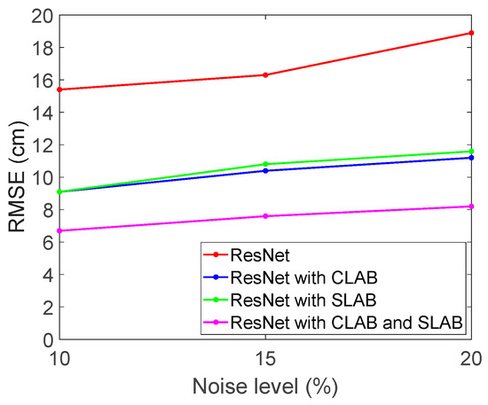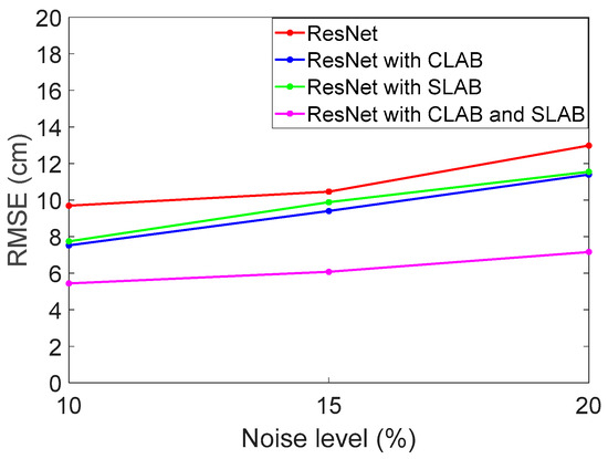 In this section, we analyze the numerical results obtained from four different models under various noise conditions. The four models include the ResNet, ResNet with CLAB, ResNet with SLAB, and ResNet with CLAB and SLAB. The evaluation is based on RMSE, which measures the positioning accuracy of each model. The networks are trained with 10% noise. Figure 6 shows the RMSE performance under different noise levels. Table 1 provides a summary of the results for different noise levels.