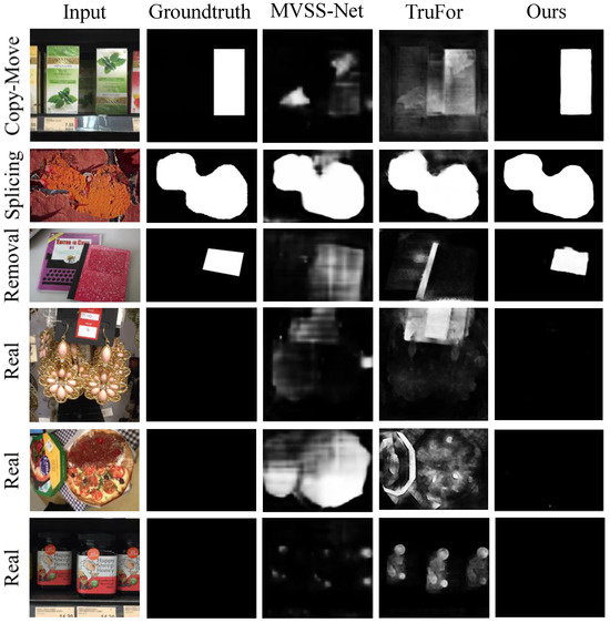 (1) Datasets: We use the same training dataset as CAT-Net v2 [7]. For testing, we employ four widely recognized public datasets: NIST (NIST+ is the same test dataset as used by TruFor, including both real and forgery images.), Coverage [28], Columbia [29], and CASIA v1+ (CASIA v1+ replaces the real images in CASIA v1, following MVSS-Net’s operation) [30,31]. These datasets include three types of tampering operations: splicing, copy-move, and inpainting. There is no overlap between the training and test datasets.
